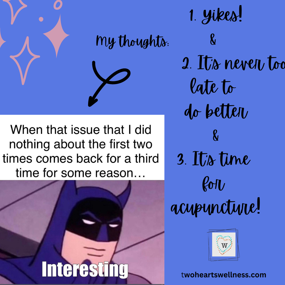 I could go on, but the long story short is this: if you have particular considerations that drive your interest in seeing an acupuncturist, you’ll probably have better luck if you find someone you trust before you have an emergency or before things become truly entrenched.