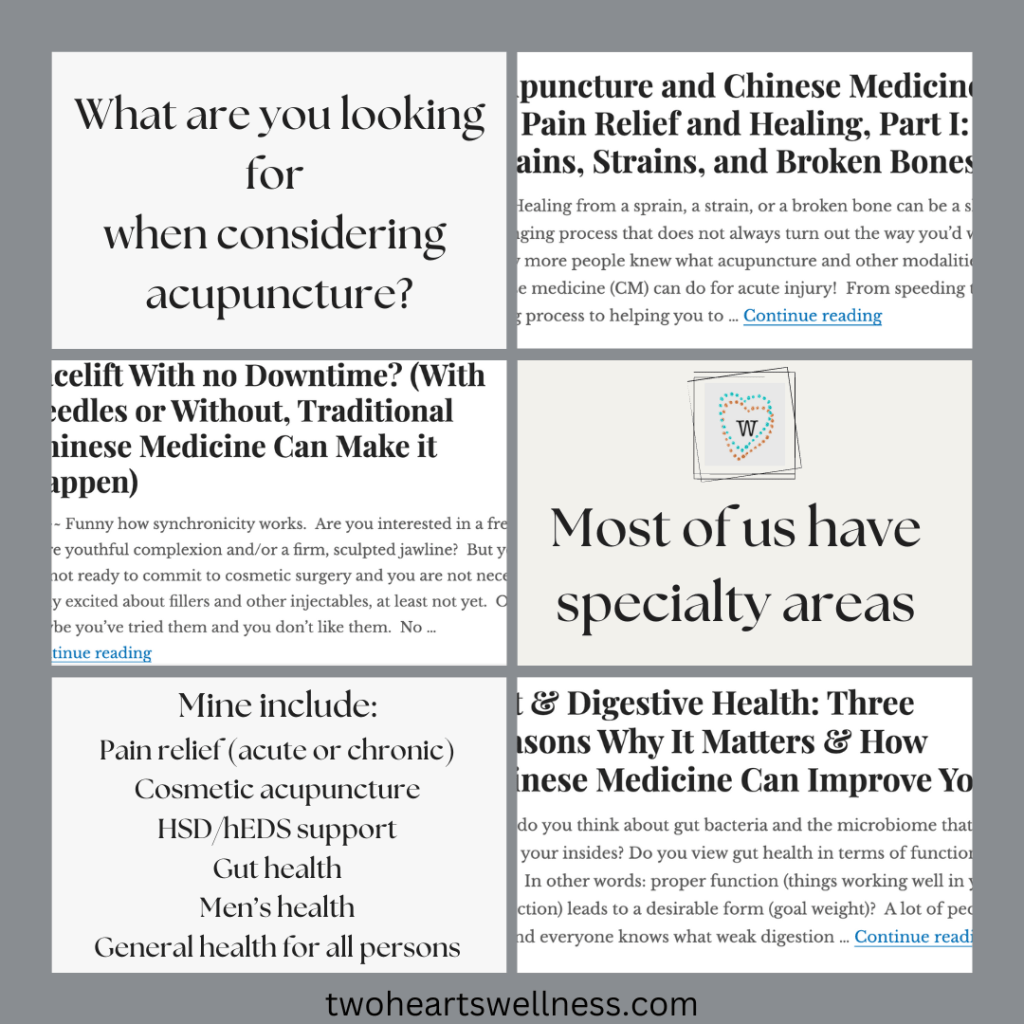 I wrote a blog post a few years back, Find an Acupuncturist: How to Find the Best Chinese Medicine Practitioner for What You Want to Accomplish, and it was good then and it’s good now. The TL/DR version, though, is that most of us specialize or have particular talents or interests. If you look for an acupuncturist, it helps to find one that specifically mentions your concern in their social media.