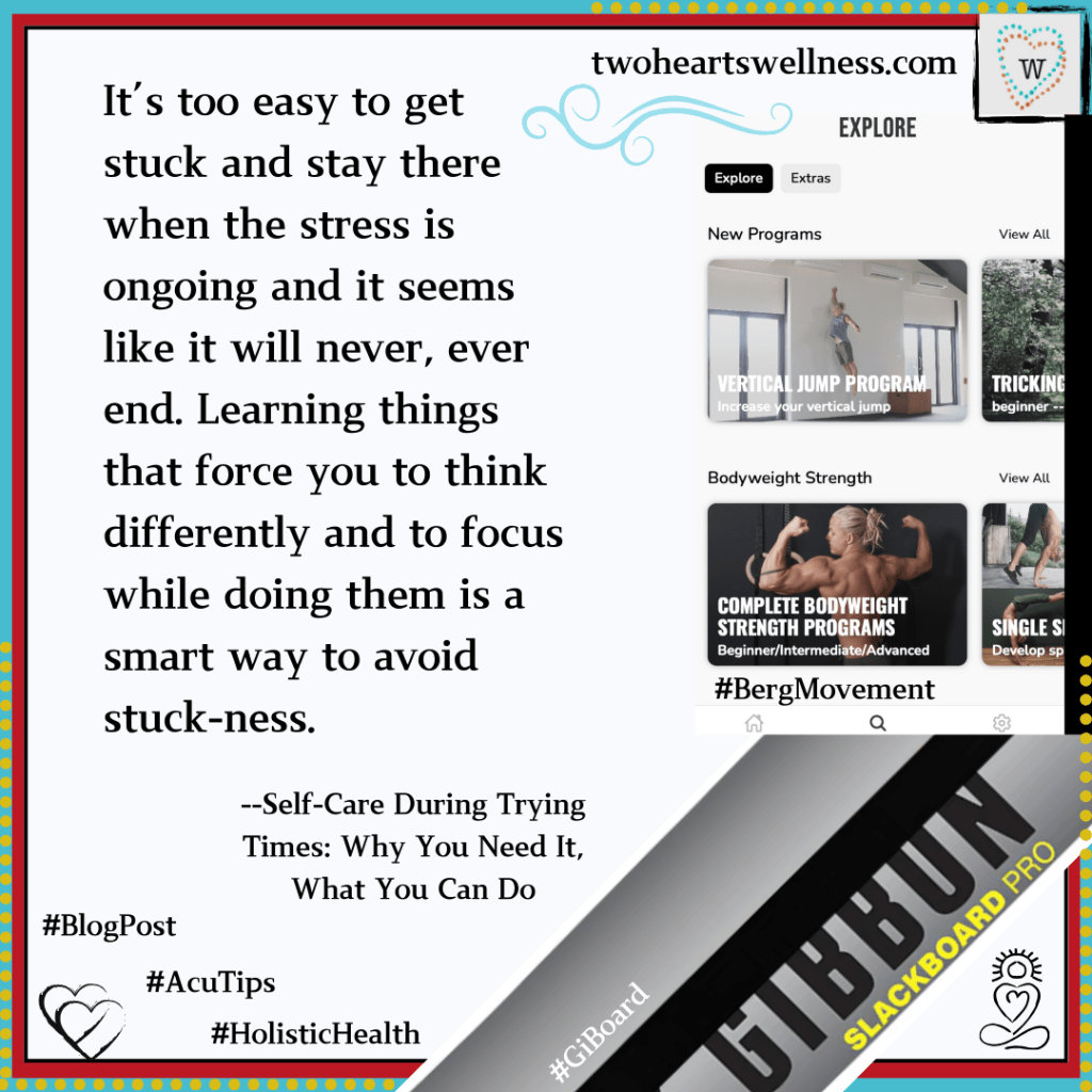 It’s too easy to get stuck and stay there when the stress is ongoing and it seems like it will never, ever end. Learning things that force you to think differently and to focus while doing them is a smart way to avoid stuck-ness.
