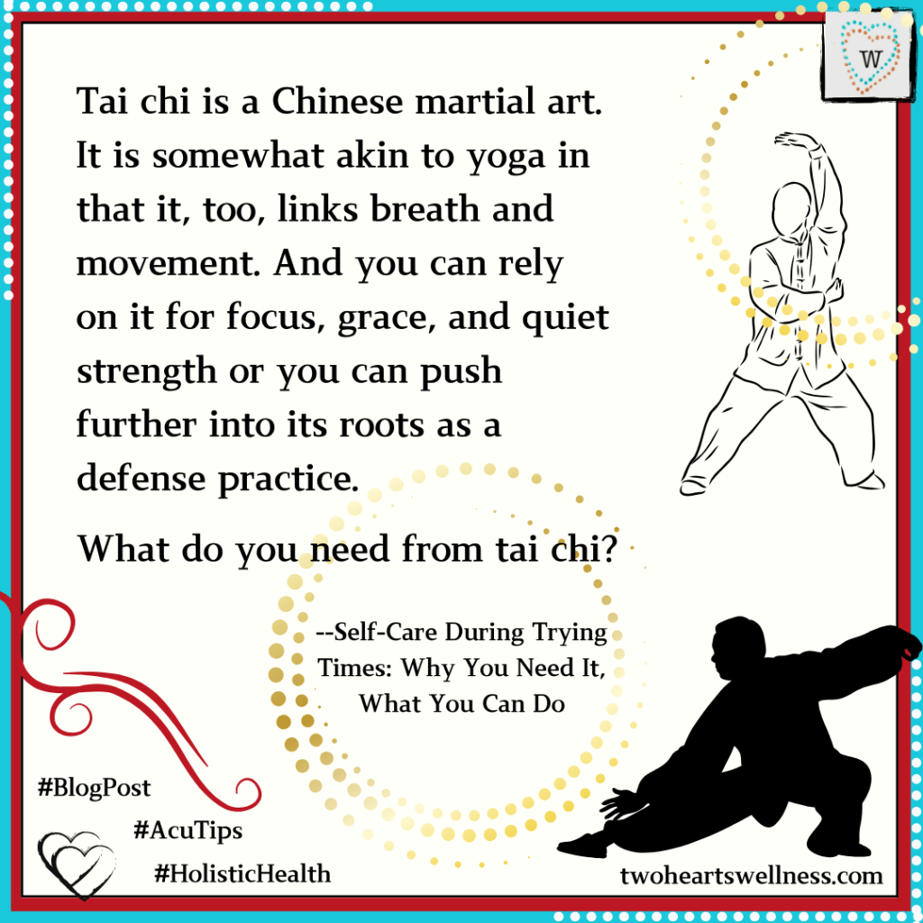 You can rely on tai chi for focus, grace, and quiet strength or you can push further into its roots as a defense practice. What would you want from tai chi?
