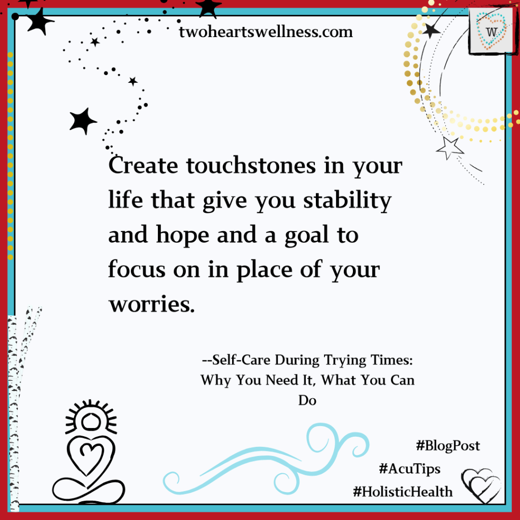 Now might be a great time to start looking for a psychotherapist. If that doesn’t appeal to you, then what about a health coach? If you have never tried it, Chinese medicine can be a lifesaver if you are chronically stressed. Before you accept the anti-anxiety drug your MD prescribed for you it could be worth your while to see what’s what at an acupuncturist’s office. Working with a personal trainer might be an option. But whatever you do, make it healthy. Create touchstones in your life that give you stability and hope and a goal to focus on in place of your worries.