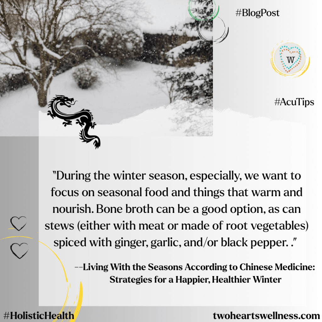 This is important year-round but that much more so in the winter. During this period, we nurture our bodies with good food and our spirits with rest, calming activities like meditation or qigong, and we certainly want to go for our acupuncture appointments. Our practitioners can offer nutrition education along with the treatment and, if they are also a health coach (I am also a health coach) it is possible to work on lifestyle revision with dedicated support based on Chinese medicine’s principles.