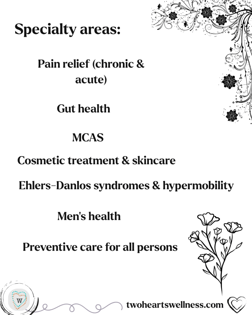 Dr. Bruno’s specialties as a Chinese medicine practitioner include: • Musculoskeletal health (acute or chronic pain relief; Ehlers Danlos syndrome & hypermobility support) • Digestive support, gut health, and weight loss • Aesthetic treatment, including scar revision • Men’s health • General preventive care and wellness support for all persons.