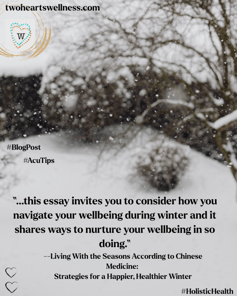 And so… this essay invites you to consider how you navigate your wellbeing during during winter and it shares ways to nurture your wellbeing in so doing. Also, and in accordance with my other essays on the subject, I base this discussion on the four primary factors related to the seasons and health according to the philosophy of Chinese medicine.1 These are: environment, organs, food, and mood.