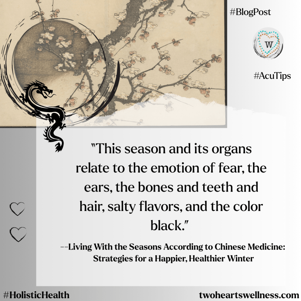 Winter’s essential element is water, and its organ association is the Kidney and its pair, the Urinary Bladder. This season and its organs relate to the emotion of fear, the ears, the bones and teeth and hair, salty flavors, and the color black. As we go inward and rest, gathering our strength and preparing for spring and a new cycle, we reflect on the virtues associated with the season. These are: strength, wisdom, and courage.