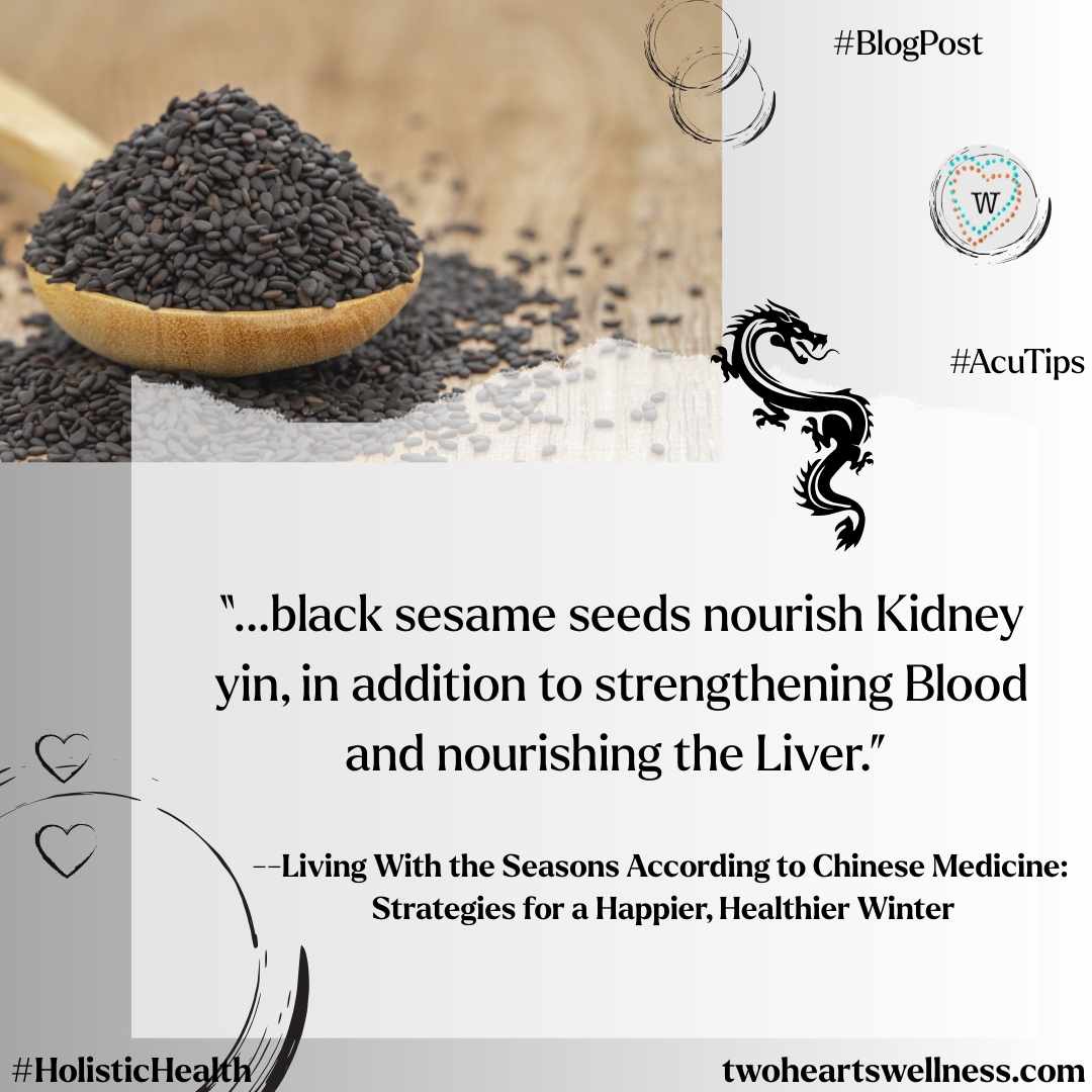 Remember that I mentioned the color black being associated with the Kidney? Well, it stands to reason, then, that black-colored food is linked to Kidney health. Black sesame seeds are noted in Western nutrition for helping to balance hormones by boosting progesterone; for us, in Chinese medicine, we will say that black sesame seeds nourish Kidney yin, in addition to strengthening Blood and nourishing the Liver. Other black foods that your acupuncturist might suggest include black beans, silkie chicken, or mulberries.
