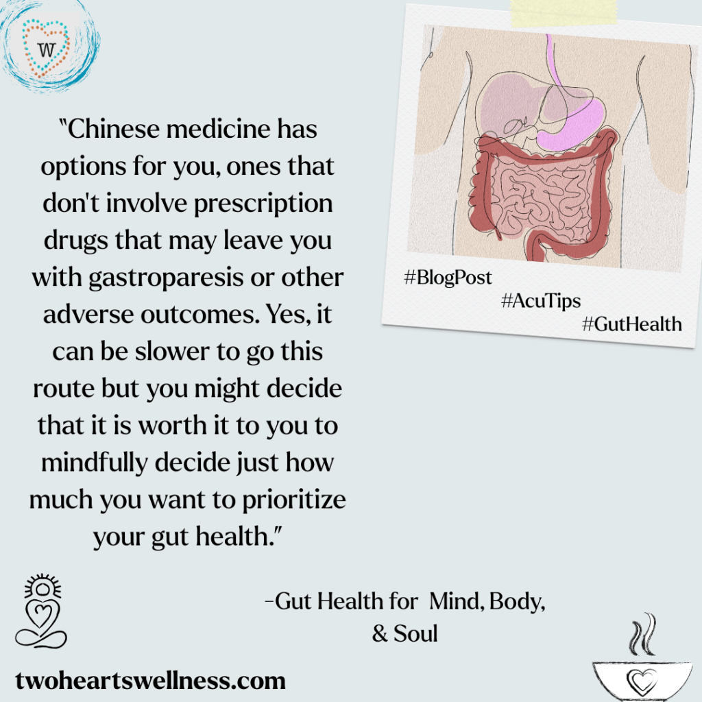 But if they’re not? Chinese medicine has options for you, ones that don’t involve prescription drugs that may leave you with gastroparesis or other adverse outcomes. Yes, it can be slower to go this route but you might decide that it is worth it to you to mindfully decide just how much you want to prioritize your gut health. When you prioritize your digestion, you are prioritizing your overall wellbeing. Gut health is true wealth, so keep reading for some useful information that might apply to yours.