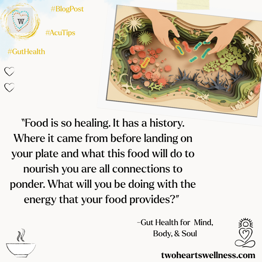 There’s more to gut health than the tangible. People have gut feelings in response to events or possibilities. When something sticks in our craw, we feel that we can’t stomach something, or we say, “That is just nauseating,” there’s a reason why these phrases resonate. Sometimes, when a person has ongoing health concerns, we might want to consider if this is what’s going on for them. Are there issues in life that they cannot swallow? (In Chinese medicine, we call that plum pit qi).