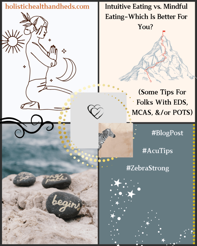 The subject of intuitive vs. mindful eating is a whole topic in and of itself. For consideration of this subject in the context of complex health presentations, see “Intuitive Eating vs. Mindful Eating–Which Is Better For You? (Some Tips For Folks With EDS, MCAS, &/or POTS).”
