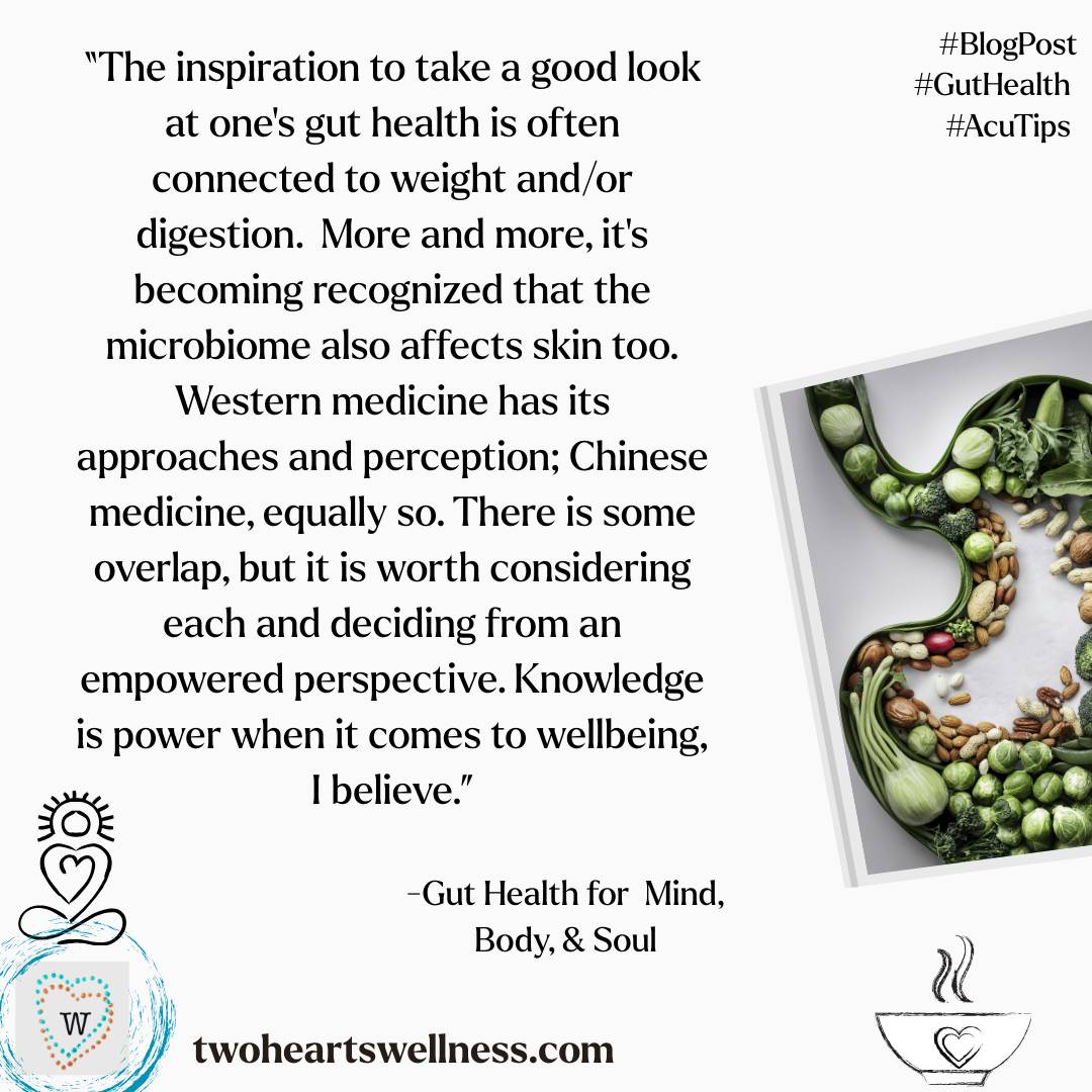 The inspiration to take a good look at one’s gut health is often connected to weight and/or digestion. More and more, it’s becoming recognized that the microbiome also affects skin too. Western medicine has its approaches and perception; Chinese medicine, equally so. There is some overlap, but it is worth considering each and deciding from an empowered perspective. Knowledge is power when it comes to wellbeing, I believe.