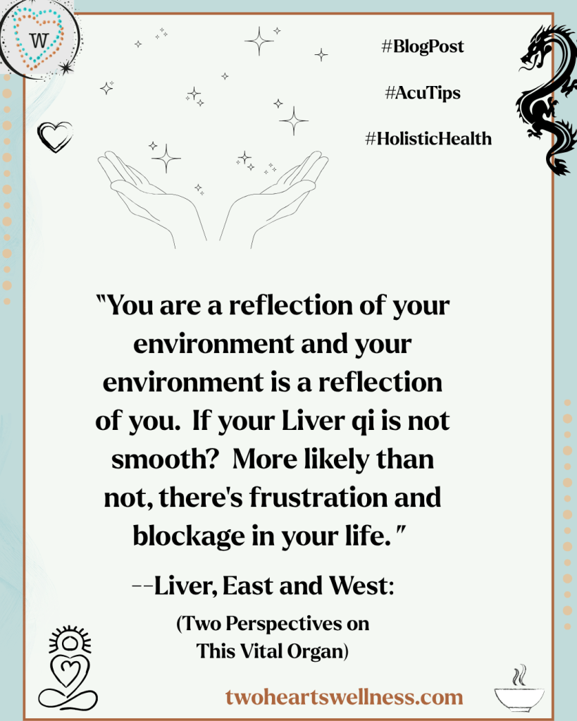 You are a reflection of your environment and your environment is a reflection of you. If your Liver qi is not smooth? More likely than not, there’s frustration and blockage in your life. Whether it’s the environment first or the Liver makes you cranky so you face the world with spikes facing outward, pacifying the Liver and redirecting your energies can truly make your environment that much more conducive to a calmer, steadier existence. If you have ungodly PMS or you’re itchy and puffy and prone to hives, there will always be the environmental factors that are part of the manifestation of Liver dis-ease. Everything is connected.